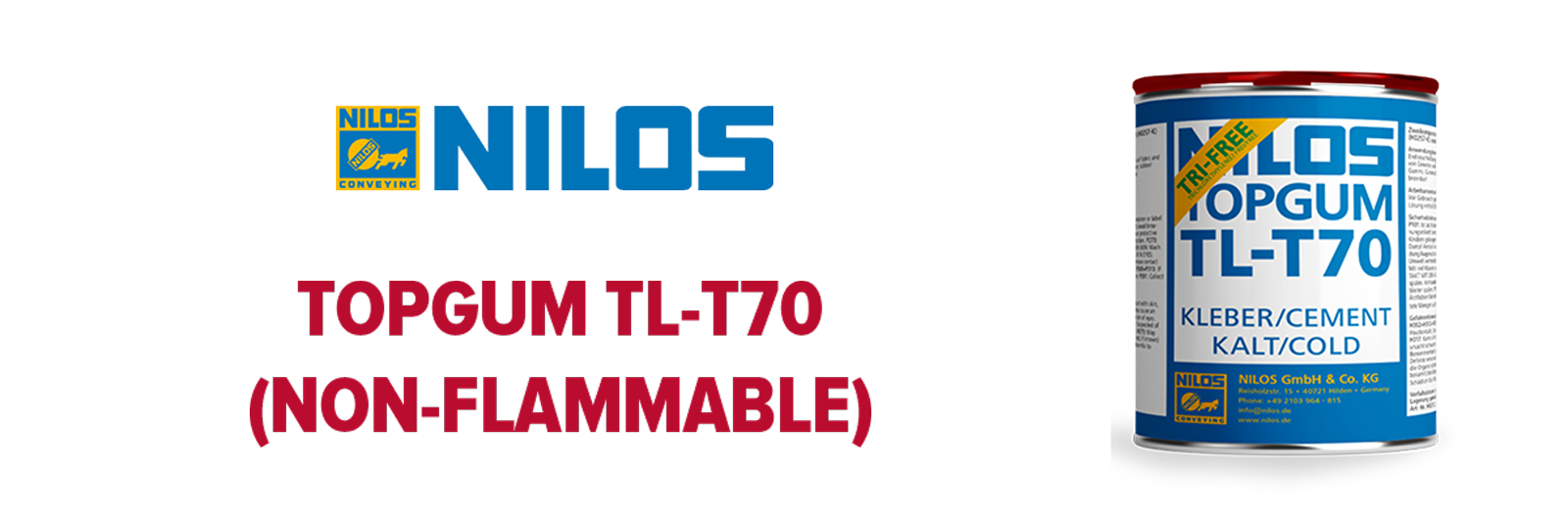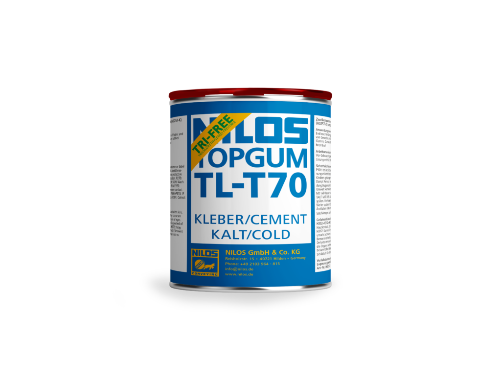 The NILOS COLD TOPGUM TL-T70 is a non-flammable, two-component cold bonding adhesive specifically developed for the repair of textile and steel cord conveyor belts, as well as for cold splicing of fabric belts, pulley lagging, chute and tank linings. Formulated without trichloroethylene, it offers a safer and more environmentally responsible alternative to traditional adhesives. Its non-flammable composition makes it ideal for use in settings where fire safety is a priority. Like TL-T60, this adhesive delivers strong, durable bonds across rubber, fabric, and metal surfaces. Distributed by ASGCO®, NILOS TOPGUM TL-T70 is trusted in a variety of industrial environments for its performance, safety, and ease of application.