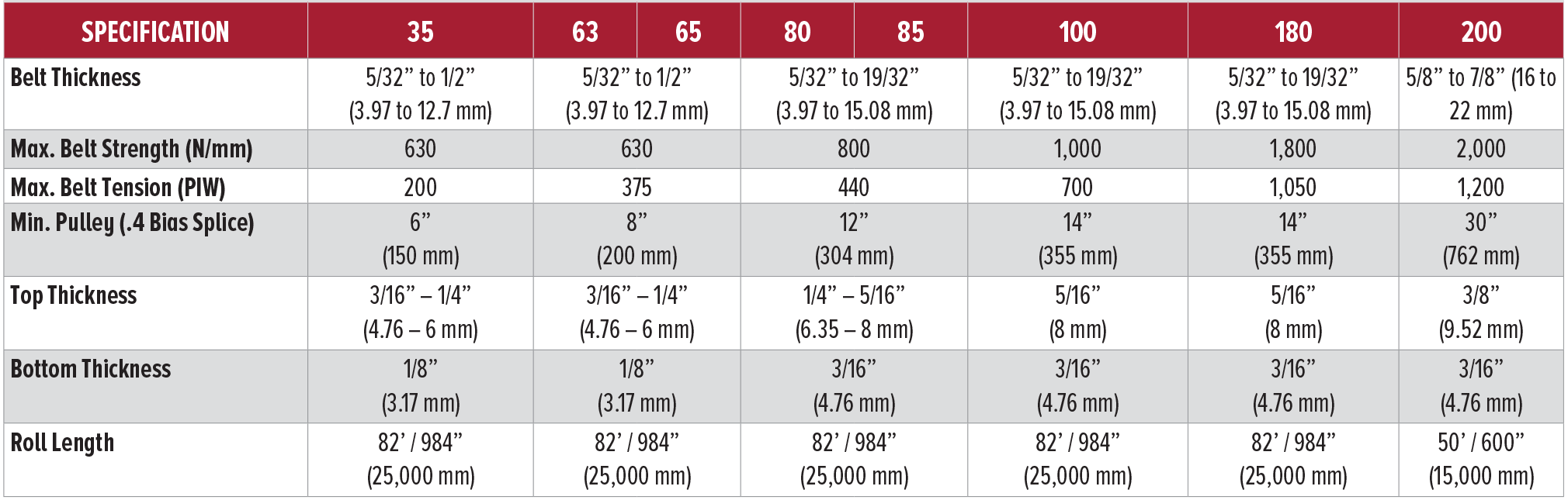 | Part Number | Description | Belt Thickness | PIW | Weight Lbs |