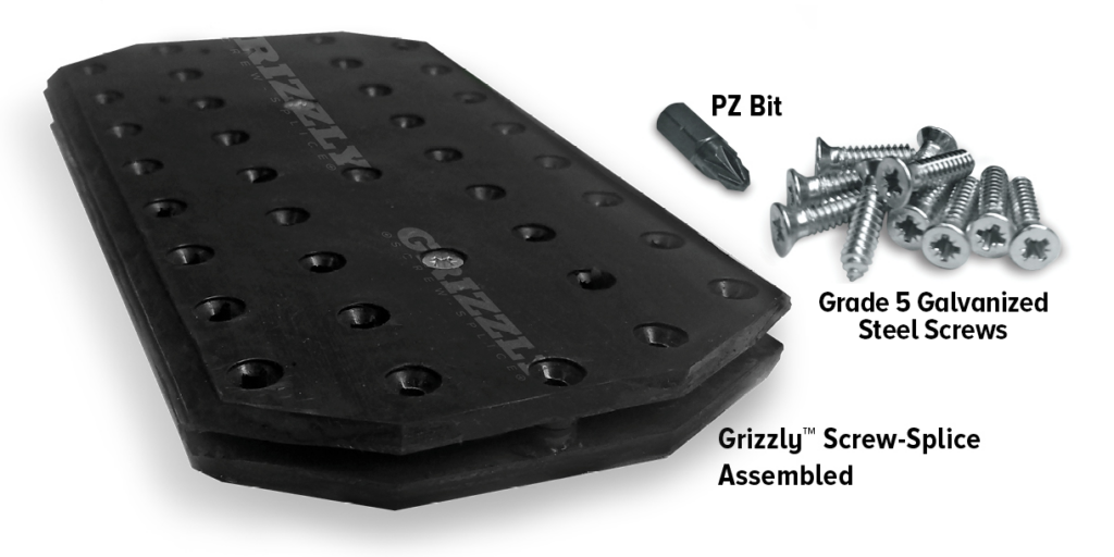 The Grizzly™ Screw-Splice is pre-assembled with the spacers installed, so that the top cover and the bottom cover holes lineup. The Grizzly™ Screw-Splice is delivered with the appropriate number of screws and PZ bits to install the screw splice (matched by inches ordered). It is available in any length between 12 inches up to the length of a roll.